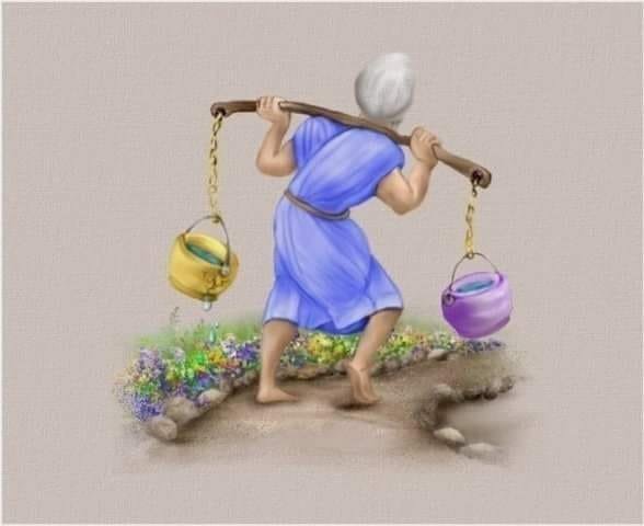 O femeie bătrână avea două vase mari, pe care le atârna de cele două capete ale unui băţ, şi le căra pe după gât.